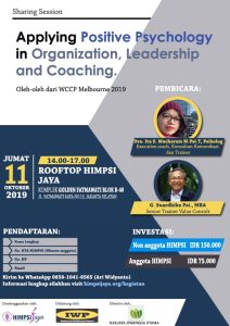 Untuk pertama kalinya, pada WCPP VI ini, kongres diadakan di benua asia-pasifik.  Ada sekitar 20 peserta Indonesia hadir dari 1.700 peserta dari berbagai belahan dunia.  Tentunya sayang bila berbagai update dalam area Positif Psikologi ini tidak dibagikan ke kalangan yang lebih luas.  Untuk itu, Himpunan Psikologi Indonesia wilayah Jakarta Raya (HIMPSI JAYA), melalui Koperasi Harjaya Jiwangga Utama (HJU) bekerja sama dengan Indonesia Wellbeing Project mengadakan sharing session dengan Topik: Applying Positive Psychology into Organization, Leadership and Coaching. Mengaplikasikan Psikologi Positif dalam Organisasi, Kepimpinan dan Coaching.